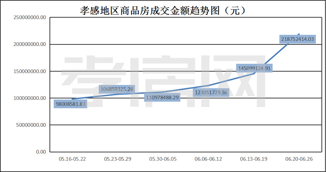 ? ? ? ?從2022年06月20日到06月26日,孝感地區(qū)銷售總交易記錄347套,環(huán)比上周(208套)上漲約66.83%;成交均價5748.61元/平方米,環(huán)比上周(6308.94元/平方米)下降約8.88%;成交建面約38053.11平方米,環(huán)比上周(22998.97平方米)上漲約65.46%;成交總金額218752414.03元,環(huán)比上周(145099124.91元)上漲約50.76%。