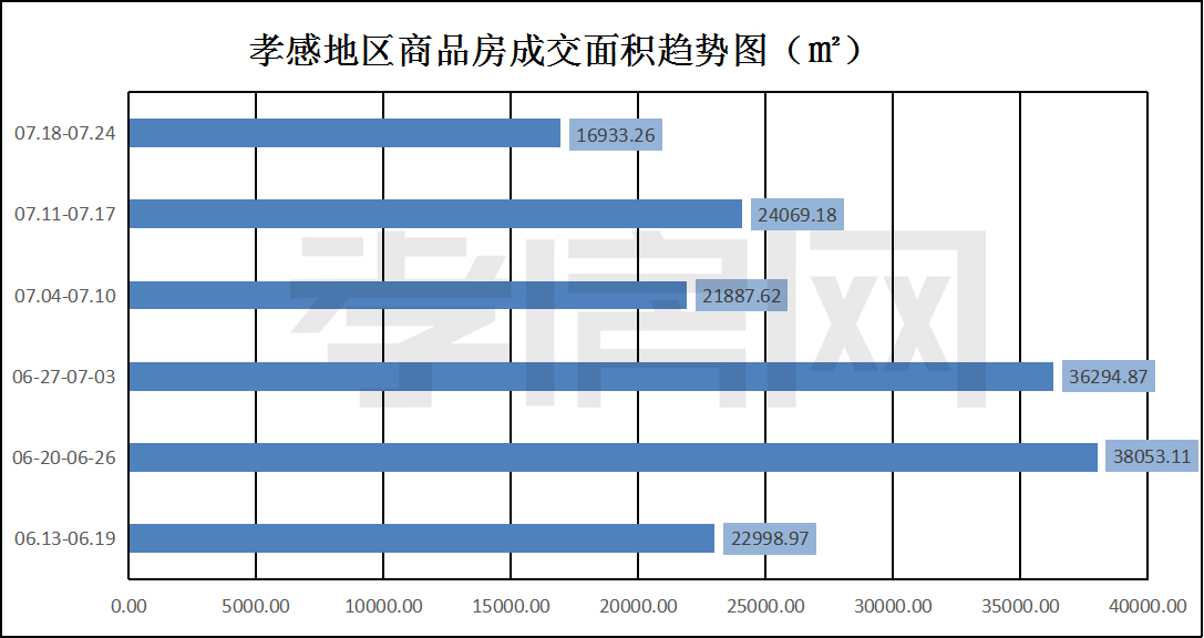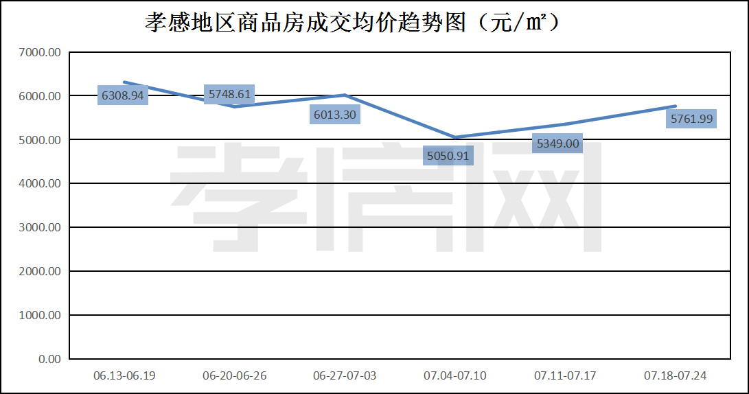 ? ? ? ?從2022年07月18日到07月24日,孝感地區(qū)銷售總交易記錄143套,環(huán)比上周(210套)下降約31.90%;成交均價(jià)5761.99元/平方米,環(huán)比上周(5349.00元/平方米)上漲約7.72%;成交建面約16933.26平方米,環(huán)比上周(24069.18平方米)下降約29.65%;成交總金額97569198.59元,環(huán)比上周(121332441.24元)下降約19.59%。