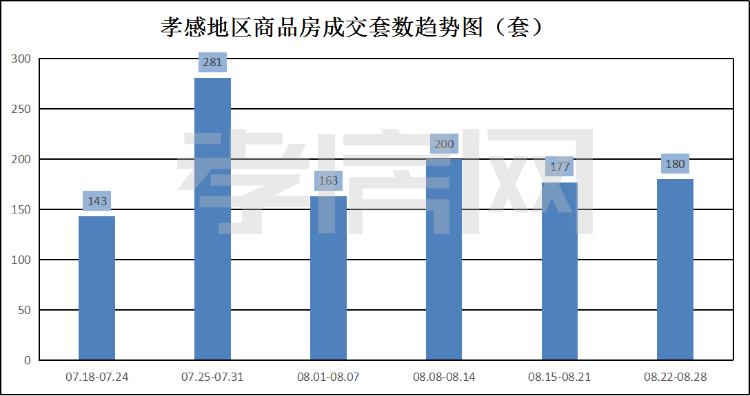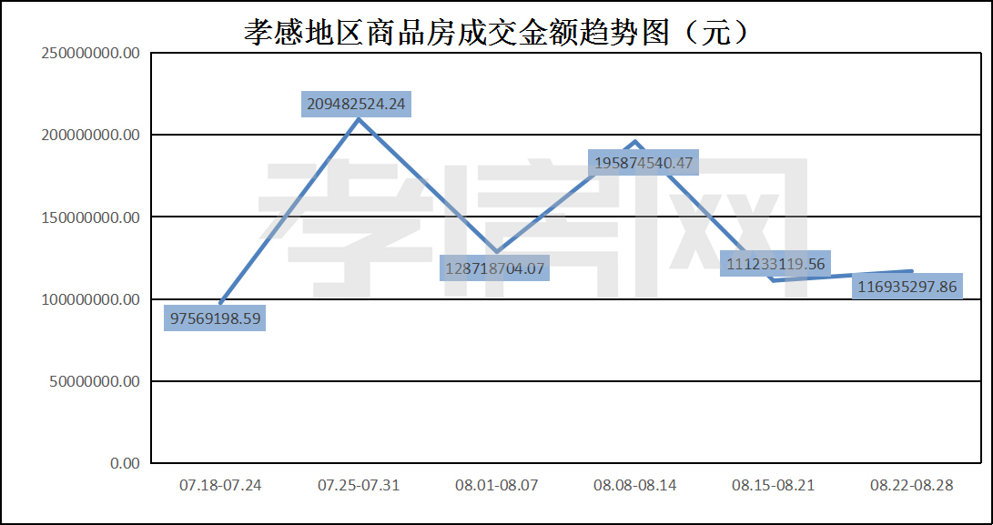? ? ? ?據(jù)孝房網(wǎng)數(shù)據(jù)研究顯示,從08月22日到08月28日,孝感地區(qū)銷售總交易記錄180套,建面約22040.27平方米,金額為116935297.86元,均價為5305.53元/平方米。