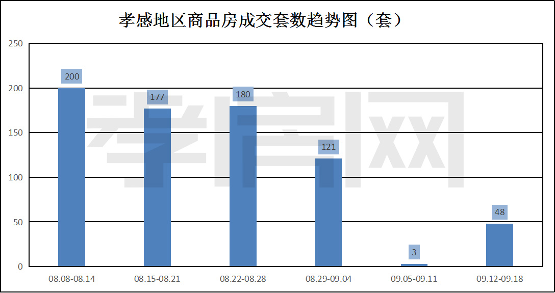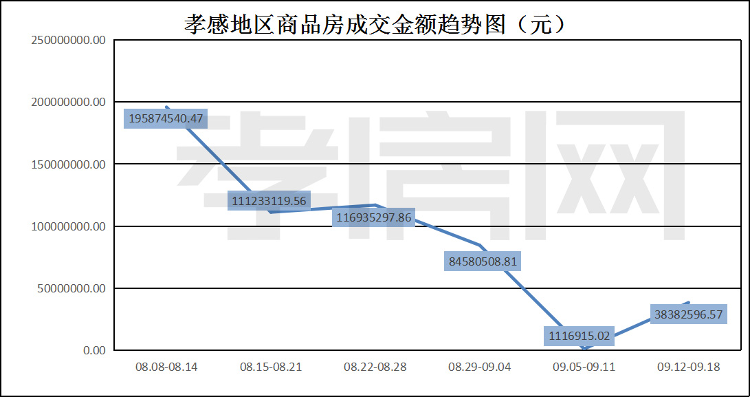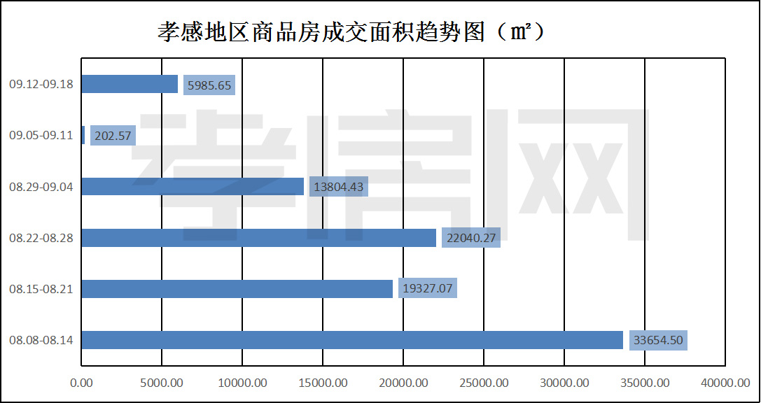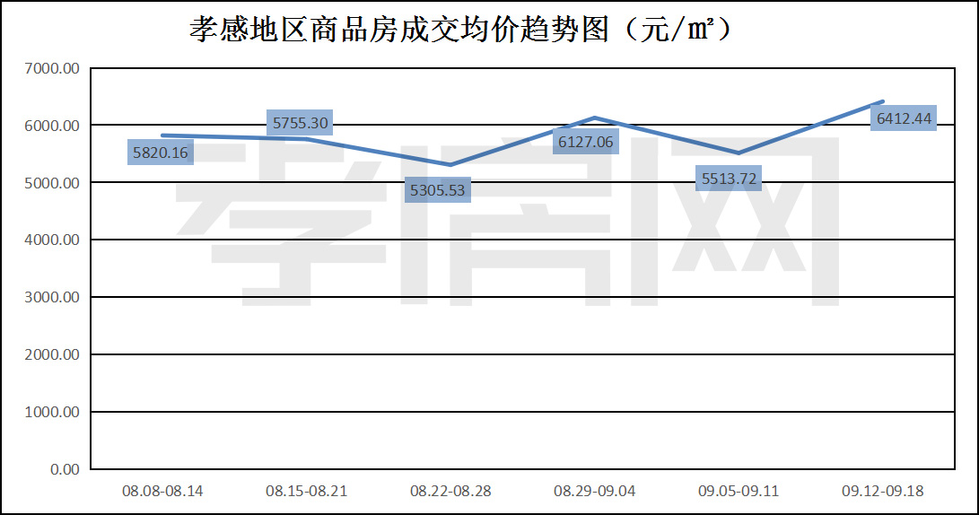 ? ? ? ?從2022年09月12日到09月18日,孝感地區(qū)銷售總交易記錄48套,環(huán)比上周(3套)上漲約1500%;成交均價(jià)6412.44元/平方米,環(huán)比上周(5513.72元/平方米)上漲約16.30%;成交建面約5985.65平方米,環(huán)比上周(202.57平方米)上漲約2854.86%;成交總金額38382596.57元,環(huán)比上周(1116915.02元)上漲約3336.48%。