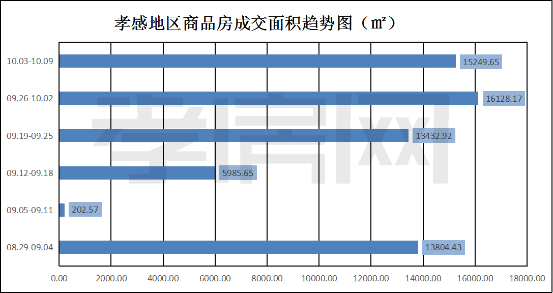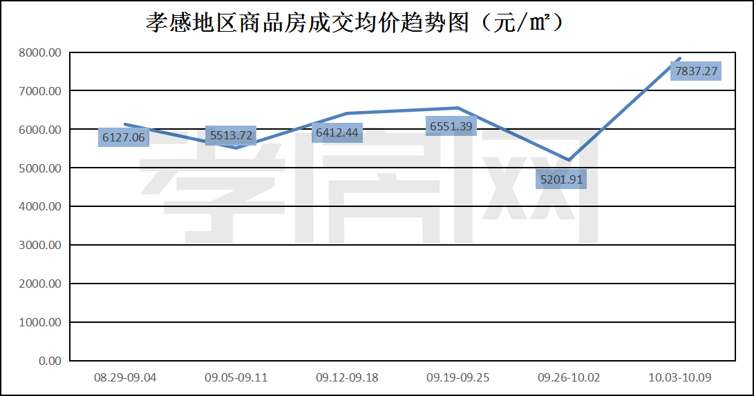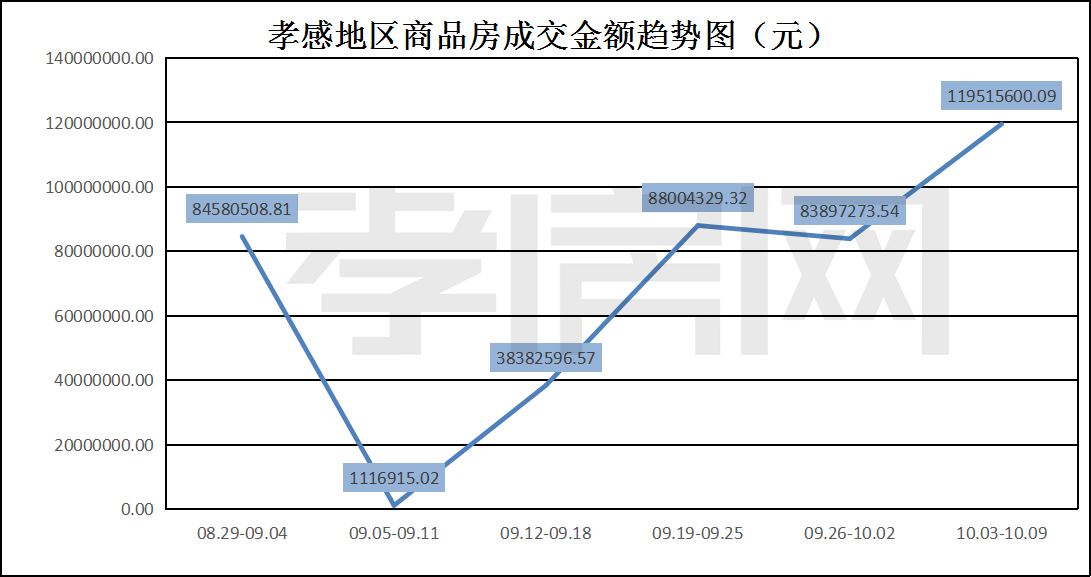 ?? ? ? 據(jù)孝房網(wǎng)數(shù)據(jù)研究顯示,從10月03日到10月09日,孝感地區(qū)銷售總交易記錄92套,建面約15249.65平方米,金額為119515600.09元,均價(jià)為7837.27元/平方米。