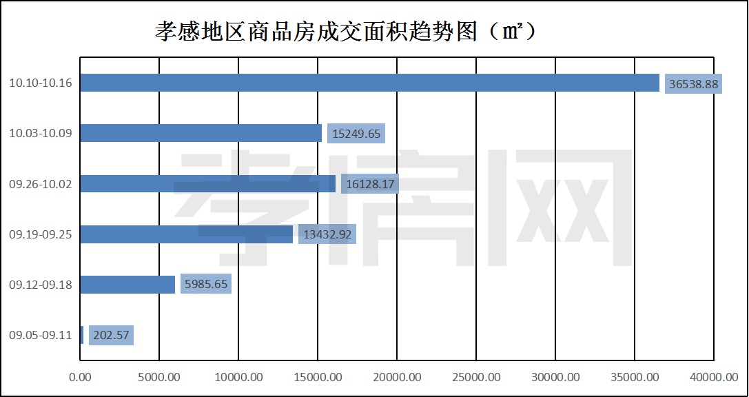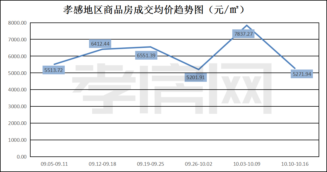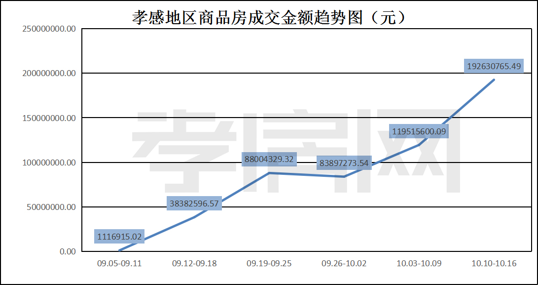 ?? ? ? 據(jù)孝房網(wǎng)數(shù)據(jù)研究顯示,從10月10日到10月16日,孝感地區(qū)銷售總交易記錄308套,建面約36538.88平方米,金額為192630765.49元,均價為5271.94元/平方米。