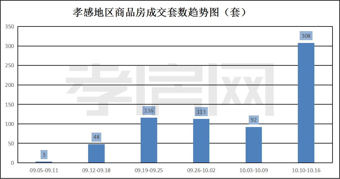 ? ? ? ?從2022年10月10日到10月16日,孝感地區(qū)銷售總交易記錄308套,環(huán)比上周(92套)上漲約234.78%;成交均價5271.94元/平方米,環(huán)比上周(7837.27元/平方米)下降約32.73%;成交建面約36538.88平方米,環(huán)比上周(15249.65平方米)上漲約139.60%;成交總金額192630765.49元,環(huán)比上周(119515600.09元)上漲約61.18%。