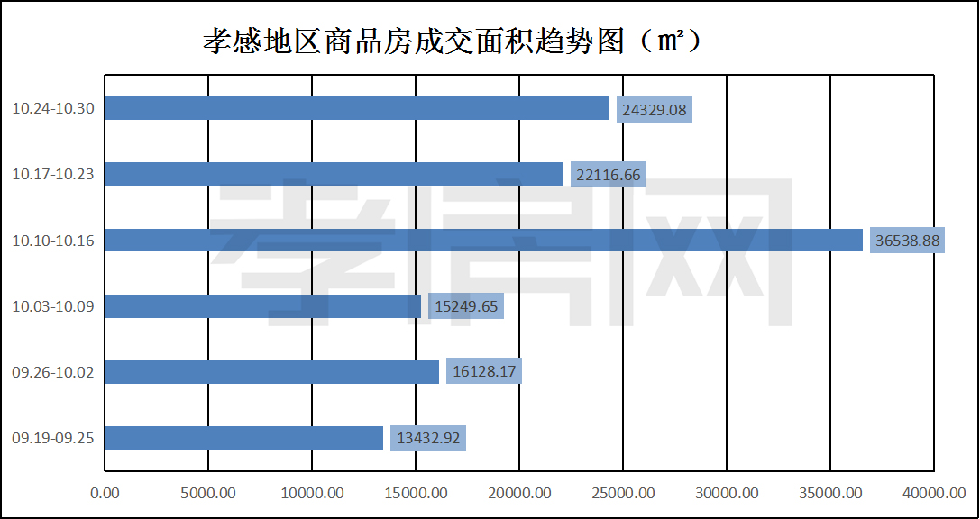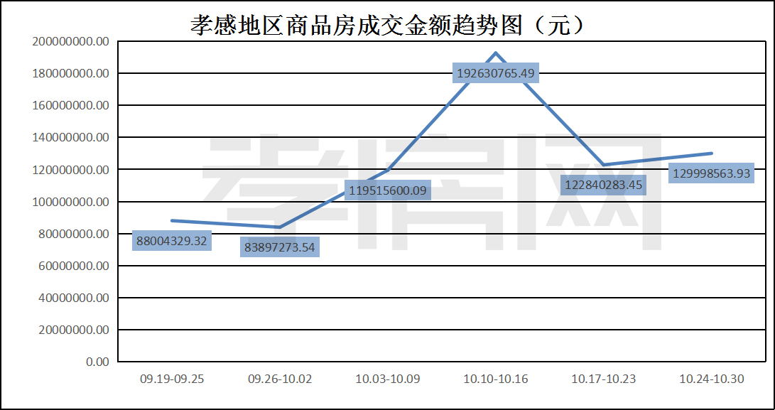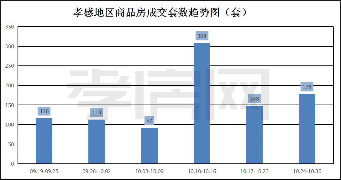 ? ? ? ?從2022年10月24日到10月30日,孝感地區(qū)銷售總交易記錄178套,環(huán)比上周(148套)上漲約20.27%;成交均價(jià)5343.34元/平方米,環(huán)比上周(5554.20元/平方米)下降約3.80%;成交建面約24329.08平方米,環(huán)比上周(22116.66平方米)上漲約10.00%;成交總金額129998563.93元,環(huán)比上周(122840283.45元)上漲約5.83%。