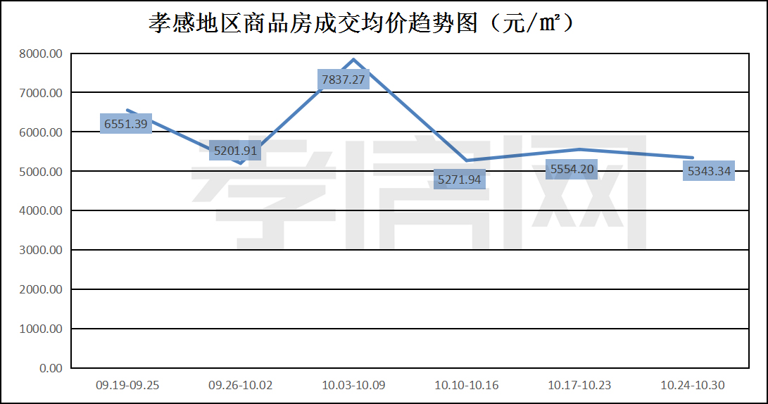 ?? ? ? 據(jù)孝房網(wǎng)數(shù)據(jù)研究顯示,從10月24日到10月30日,孝感地區(qū)銷售總交易記錄178套,建面約24329.08平方米,金額為129998563.93元,均價(jià)為5343.34元/平方米。