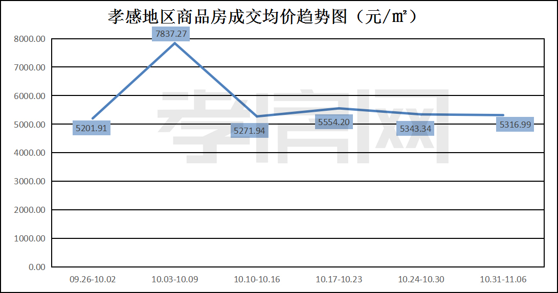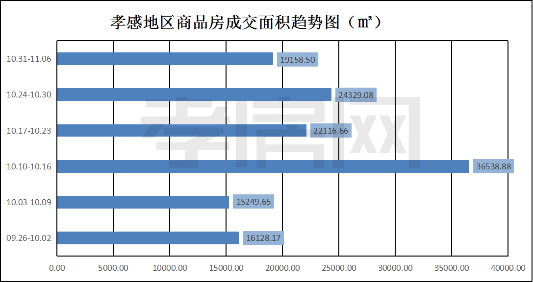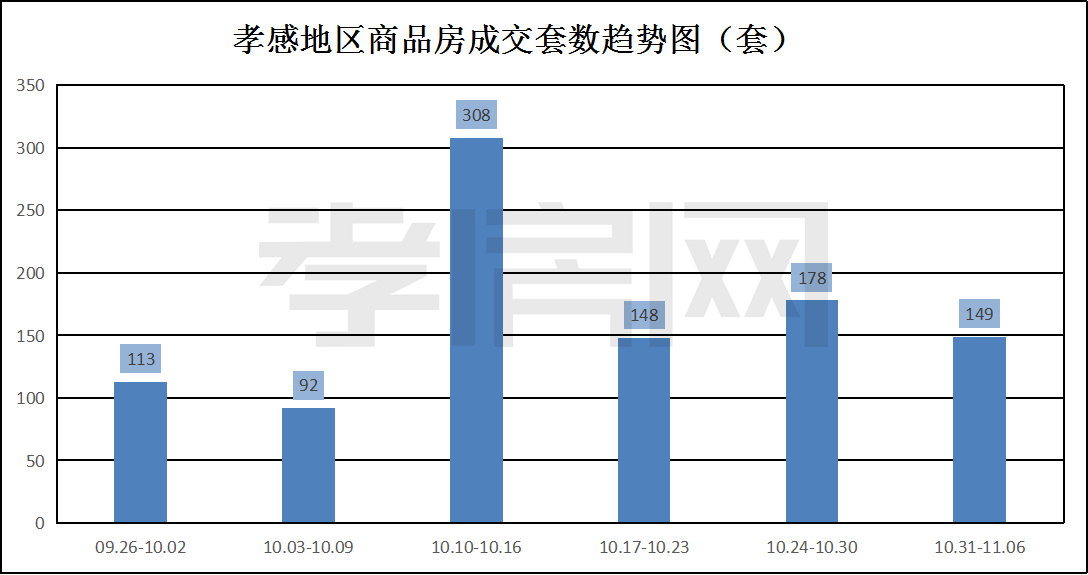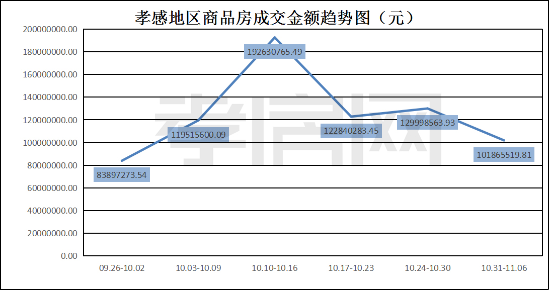 ?? ? ? 據(jù)孝房網(wǎng)數(shù)據(jù)研究顯示,從10月31日到11月06日,孝感地區(qū)銷售總交易記錄149套,建面約19158.50平方米,金額為101865519.81元,均價(jià)為5316.99元/平方米。