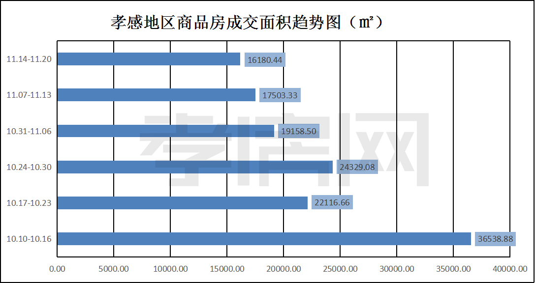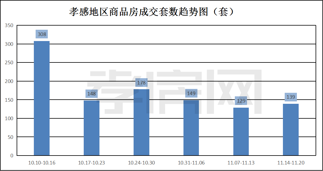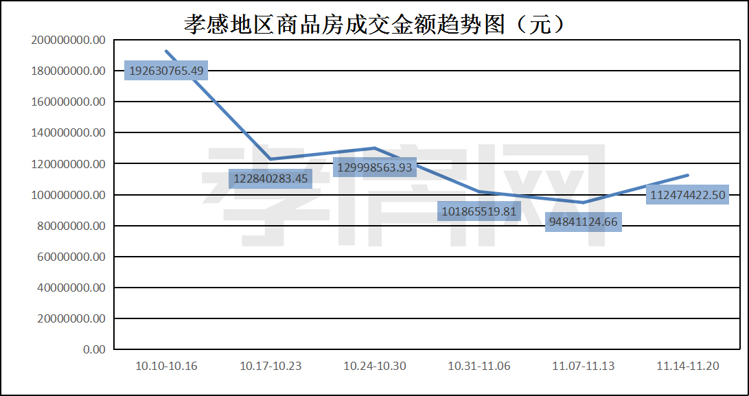 ?? ? ? 據(jù)孝房網(wǎng)數(shù)據(jù)研究顯示,從11月14日到11月20日,孝感地區(qū)銷售總交易記錄139套,建面約16180.44平方米,金額為112474422.50元,均價為6951.26元/平方米。