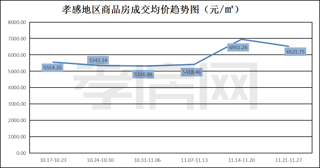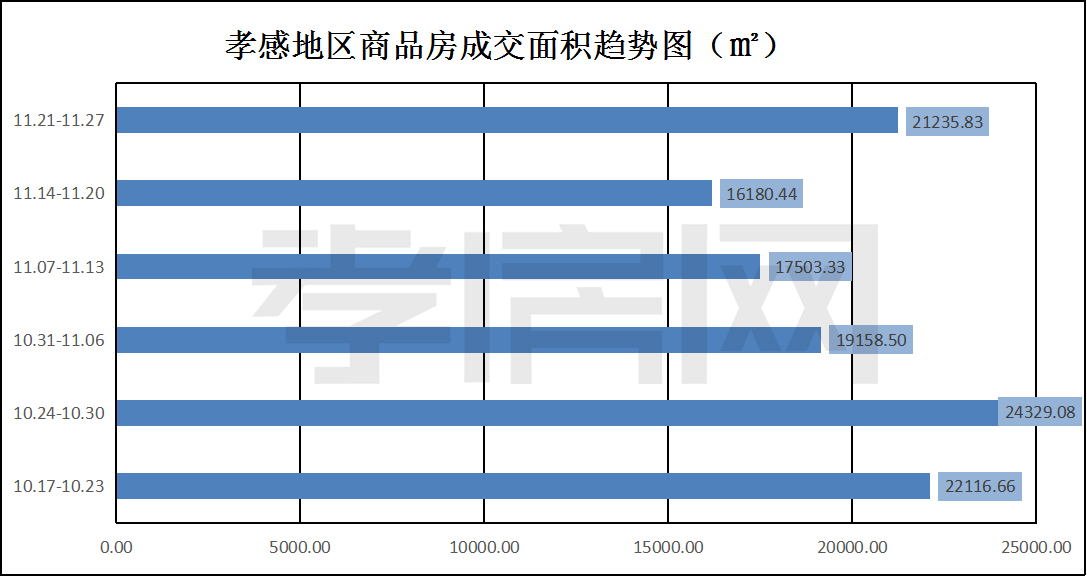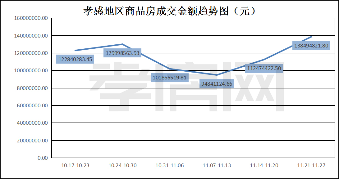 ? ? ? ?從2022年11月21日到11月27日,孝感地區(qū)銷售總交易記錄186套,環(huán)比上周(139套)上漲約33.81%;成交均價(jià)6521.75元/平方米,環(huán)比上周(6951.26元/平方米)下降約6.18%;成交建面約21235.83平方米,環(huán)比上周(16180.44平方米)上漲約31.24%;成交總金額138494821.80元,環(huán)比上周(112474422.50元)上漲約23.13%。