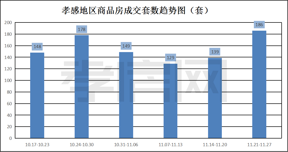 ?? ? ? 據(jù)孝房網(wǎng)數(shù)據(jù)研究顯示,從11月21日到11月27日,孝感地區(qū)銷售總交易記錄186套,建面約21235.83平方米,金額為138494821.80元,均價(jià)為6521.75元/平方米。