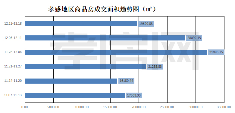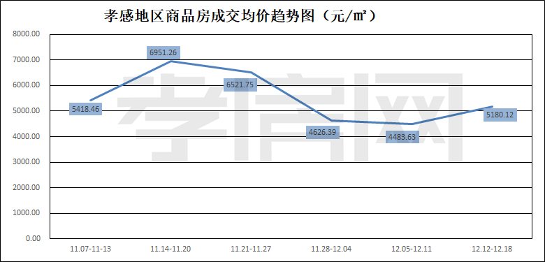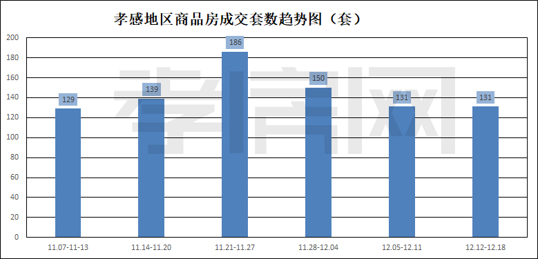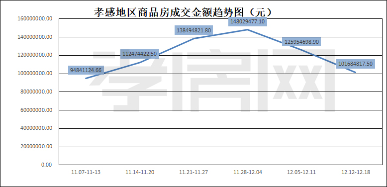 ?? ? ? 據(jù)孝房網(wǎng)數(shù)據(jù)研究顯示,從12月12日到12月18日,孝感地區(qū)銷售總交易記錄131套,建面約19629.83平方米,金額為101684817.50元,均價(jià)為5180.12元/平方米。