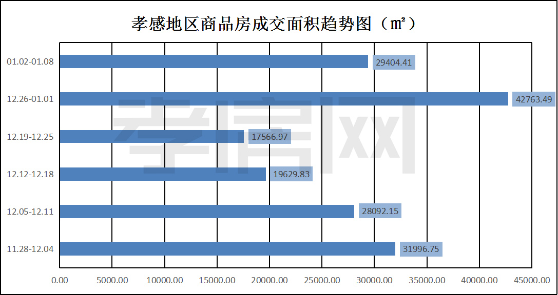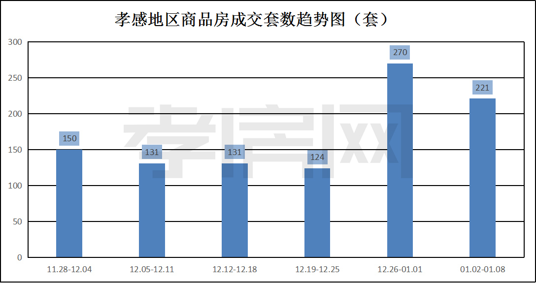 ??? ? ? 據(jù)孝房網(wǎng)數(shù)據(jù)研究顯示,從01月02日到01月08日,孝感地區(qū)銷售總交易記錄221套,建面約29404.41平方米,金額為174434723.10元,均價為5671.19元/平方米。