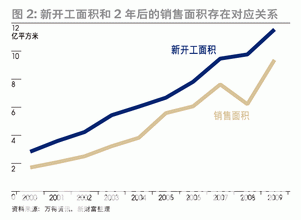 如果考慮到未來(lái)幾年高增長(zhǎng)的開工面積和竣工面積,房地產(chǎn)供需關(guān)系可能很快發(fā)生逆轉(zhuǎn)。數(shù)據(jù)顯示,2008年的新開工面積9.76億平方米,如果2010年全部進(jìn)入銷售階段,供需缺口縮小至2%。而2009年新開工面積達(dá)到11.54億平方米,如果2011年也全部進(jìn)入銷售階段,則供應(yīng)已超過(guò)需求總面積,約過(guò)剩15%(表6,圖2)。