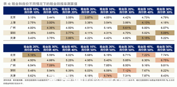 經(jīng)過(guò)測(cè)算,深圳和北京的數(shù)據(jù)不樂(lè)觀。以深圳為例進(jìn)一步說(shuō)明,如若租金回報(bào)率上升至5.07%時(shí),需租金上漲30%和房?jī)r(jià)下跌30%,租金回報(bào)率與套住房貸款利率的差值才可以回歸至0.2%左右;當(dāng)租金回報(bào)率升至3.88%時(shí),租金需上漲10%和房?jī)r(jià)下跌20%,這一差值便可實(shí)現(xiàn)回歸。北京的情況更差一點(diǎn),租金回報(bào)率升至5.09%,需租金上漲20%,同時(shí)房?jī)r(jià)下跌40%;若租金回報(bào)率位于3.9%的水平,則需租金上漲20%,同時(shí)房?jī)r(jià)下跌20%,租金回報(bào)率與套住房貸款利率的差值才會(huì)回落至0.2%左右(表4)。