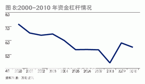2008年,為防止房地產(chǎn)投資過(guò)熱,監(jiān)管部門將房地產(chǎn)開發(fā)商的自有資金比率提高至35%,對(duì)應(yīng)的理論成本杠桿為2.86倍。2009年,房地產(chǎn)開發(fā)自有資金比率降至 20%,對(duì)應(yīng)的理論成本杠桿升至5倍。但房地產(chǎn)商實(shí)際上的資金杠桿高于這一數(shù)字。在開發(fā)環(huán)節(jié),房地產(chǎn)商2008年的實(shí)際資金杠桿達(dá)4.39倍,2009年為5.82倍(圖8)?! ?/p>