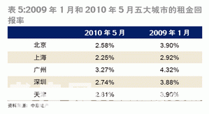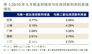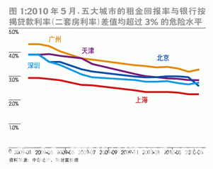 我們來(lái)對(duì)比2009年1月與2010年5月的數(shù)據(jù)。2010年5月,雖然五大城市的租金回報(bào)率與套住房貸款利率的差值處在2.5%左右,尚未碰及警戒線。但租金回報(bào)率與二套住房貸款利率之差在4%左右,釋放出強(qiáng)烈的危險(xiǎn)信號(hào)(表1)。