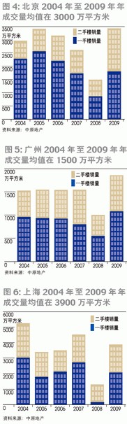 這樣的成交量水平線在北京、上海和廣州同樣存在。2004-2007年,北京成交量穩(wěn)定在3000萬(wàn)平方米,2008年下降50%至1500萬(wàn)平方米,被壓抑的1500萬(wàn)平方米需求也在2009年得到釋放。廣州的數(shù)據(jù)也佐證了同樣的規(guī)律,2004-2007年,廣州年成交量穩(wěn)定在1500萬(wàn)平方米的水平,2008年被壓抑的500-1000萬(wàn)平方米需求在2009年全部得到釋放。稍有例外的是上海,雖然相比2007年,2008年上海的成交量下降40%至2700萬(wàn)平方米,被壓抑的成交量在2009年得到釋放,但上海2009年的成交量正好落在近六年的成交量均值上(圖4、圖5、圖6)。