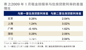 但當(dāng)時(shí)間回溯至2009年1月,基本面是另一番景象。除上海外,租金回報(bào)率與二套住房貸款利率之差在2%左右,還遠(yuǎn)離4%的警戒線。租金回報(bào)率與套住房貸款利率差,在0.2%附近,年租金回報(bào)率基本可覆蓋買房的年資金成本(但不意味著月租金收入=月供,因?yàn)槟曜饨鸹貓?bào)率未考慮時(shí)間成本。根據(jù)中原地產(chǎn)的數(shù)據(jù),深圳的租金收入/月供在0.4至0.7之間波動(dòng)),房?jī)r(jià)有很強(qiáng)烈的上漲動(dòng)力(表2)。