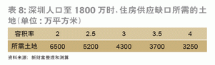 深圳總?cè)丝?300萬(wàn),其中常住人口800萬(wàn),流動(dòng)人口500萬(wàn)。按常住人口人均30平方米、流動(dòng)人口10平方米計(jì)算,共需住房面積2.9億平方米。從總量上看,目前過(guò)剩1.1億平方米。如果深圳總?cè)丝谶_(dá)到1800萬(wàn)(其中流動(dòng)人口600萬(wàn)、常住人口1200萬(wàn)),以常住人口人均30平方米、流動(dòng)人口人均10平方米計(jì)算,則深圳住宅面積總需求為4.1億平方米,供需基本平衡。大限下,假設(shè)常住人口三口之家住房面積120平方米,則深圳住宅面積總需求為5.3億平方米,缺口1.3億平方米。而這一缺口如果按2倍容積率計(jì)算,需0.65億平方米土地;按4倍容積率計(jì)算,則需0.325億平方米土地面積(表8)?! ?/p>