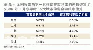 如果要回到2009年初的租金回報(bào)率與套住房銀行按揭貸款利率的差值水平,各主要城市對(duì)應(yīng)的租金回報(bào)率分別應(yīng)為:北京5.09%、上海4.11%、廣州5.51%、深圳5.07%、天津5.09%(表3)。如果套房利率優(yōu)惠恢復(fù)至7折,五大城市租金回報(bào)率分別為:北京3.9%,上海2.92%,廣州4.32,深圳3.88%,天津3.9%。