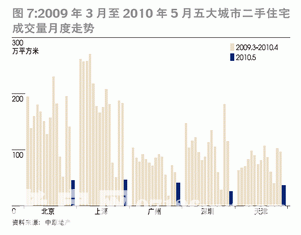 基于以上分析,我們認(rèn)為,此次房地產(chǎn)調(diào)控將使得成交量下降至近6年的均線附近。由此,除了上海,另外三個(gè)一線城市均面臨房產(chǎn)成交量向均值回歸的壓力。若2010年成交量降至均值附近,相較2009年,深圳的成交量需下降30%,北京成交量下降15%,廣州成交量下降17%,上海成交量略有下降或持平。實(shí)際情況可能更糟糕一些,根據(jù)中原地產(chǎn)監(jiān)測(cè)到的數(shù)據(jù),2010年5月,北京、上海、廣州、深圳和天津五大城市二手住宅成交量同比下滑嚴(yán)重(圖7)。